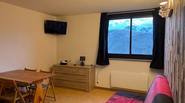 D'une surface de 27,5m2, il est composé d'une entrée avec placard de rangement, une alcôve où se trouve deux lits de 90cm, superposés. Une salle de bain sur votre gauche avec baignoire, vasque, wc et sèche-serviettes. La pièce de vie équipée d'un canapé convertible de type clic-clac de 140cm, d'une table et ses quatre chaises, de petit mobilier, et d'une télévision. Une grande fenêtre coulissante équipée de volets roulants vous offrira une superbe vue sur la vallée, épargnant du bruit occasionné par les parkings et leurs voitures : Ces derniers se trouvant à l'opposé du bâtiment. Une petite cuisine séparée équipée de plaques vitrocéramiques mais surtout d'un lave-vaisselle, vous évitant ainsi la lourde corvée d'après repas. Après tout, c'est les vacances ! Très important aussi, la présence d'un casier à skis individuel et sécurisé, à l'entrée de la résidence.